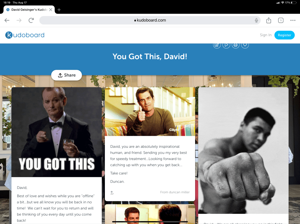The other big and difficult step for me as I that I decided to start my medical leave from work last Friday. Outside of the physical challenges I have had over the past few months, taking a leave from work has been one of the greatest mental challenges for me in my lifetime. I love what I do. I love my colleagues, I love my work, I love my clients. The idea of just stopping that for a few months is hard to fathom. I realized years ago that I don’t define who I am by my job or career but it has been and is a huge part of me. A two-week vacation is probably the longest I have ever taken and even then I am usually checking email and responding during that time. The idea of taking two plus months is frightening. But that is self imposed fear. Every single one of my colleagues has been amazingly supportive of my journey and has created a tremendous support system for me on both a professional and personal level. They have shared dozens of thoughtful messages upon my departure including this amazing Kudoboard that will join me on my stay at the hospital coming up. To have a career in a place with such special people is a blessing.