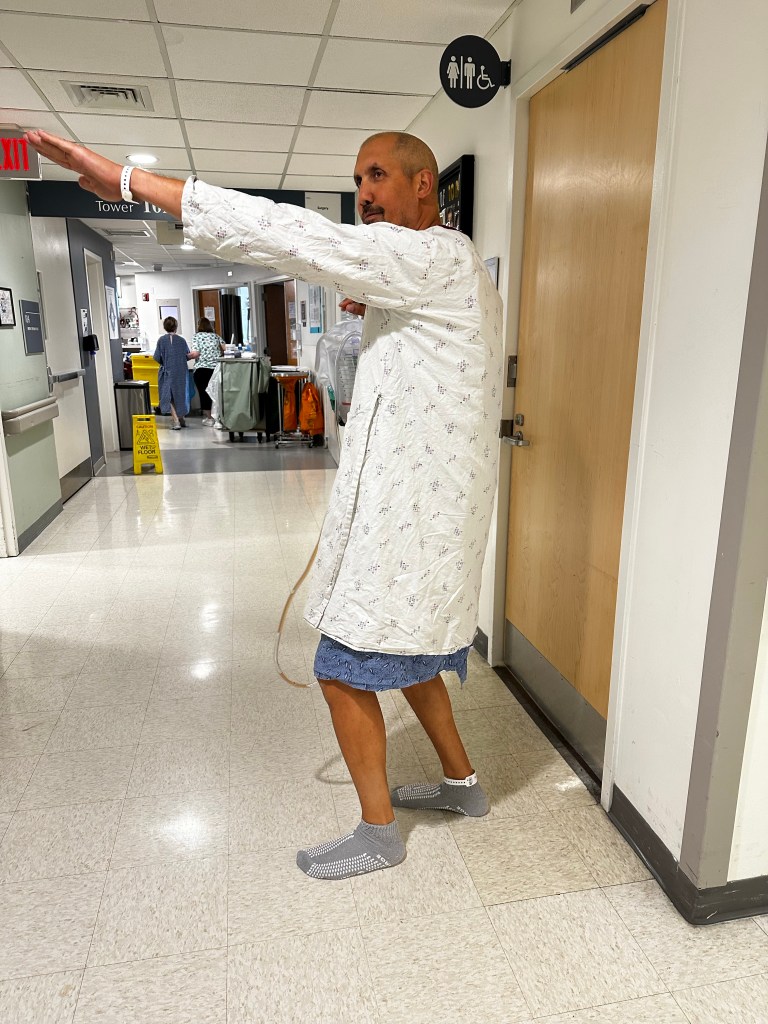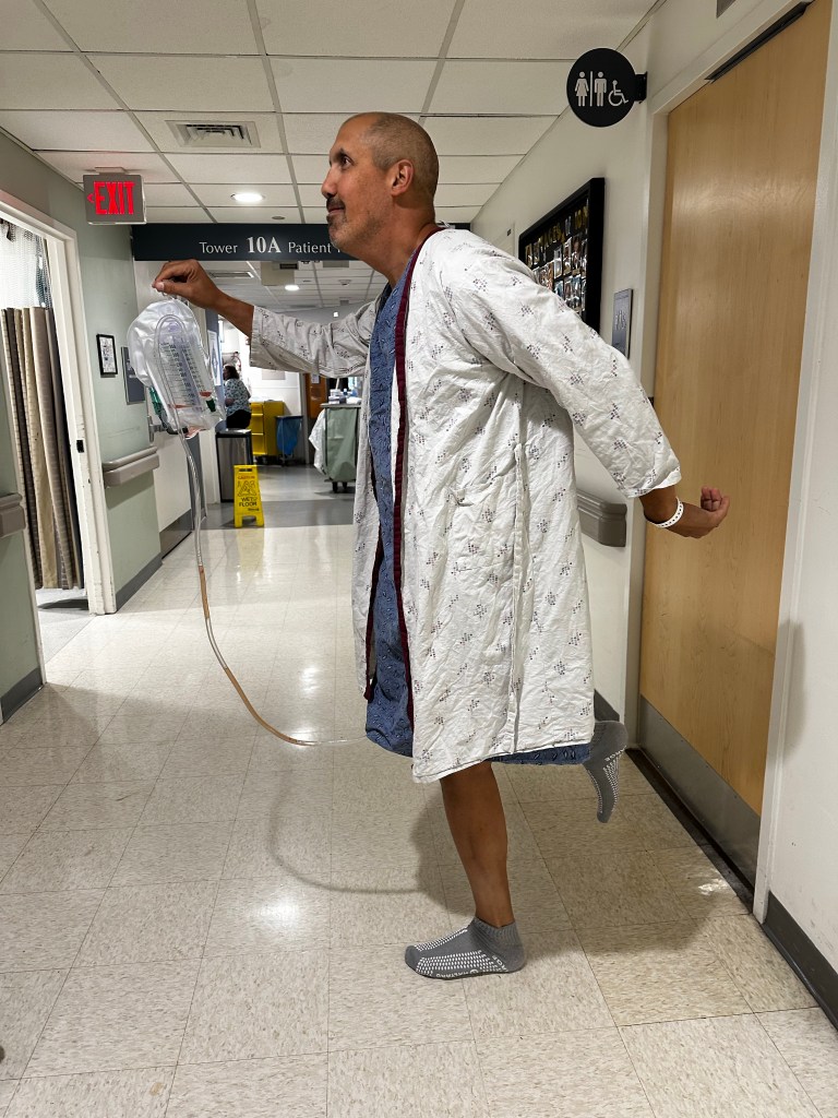 The first day in the hospital wasn’t that bad. I am really pretty good at managing pain and so I asked them to start taking me off of some of the narcotic pain meds. That stuff, albeit a medical miracle, can also create some other issues and I felt like I could manage the pain without it. I spent most of day 1 in bed but did manage to get up and take a brief walk. I was a bit wobbly and uncomfortable but was able to get it done.